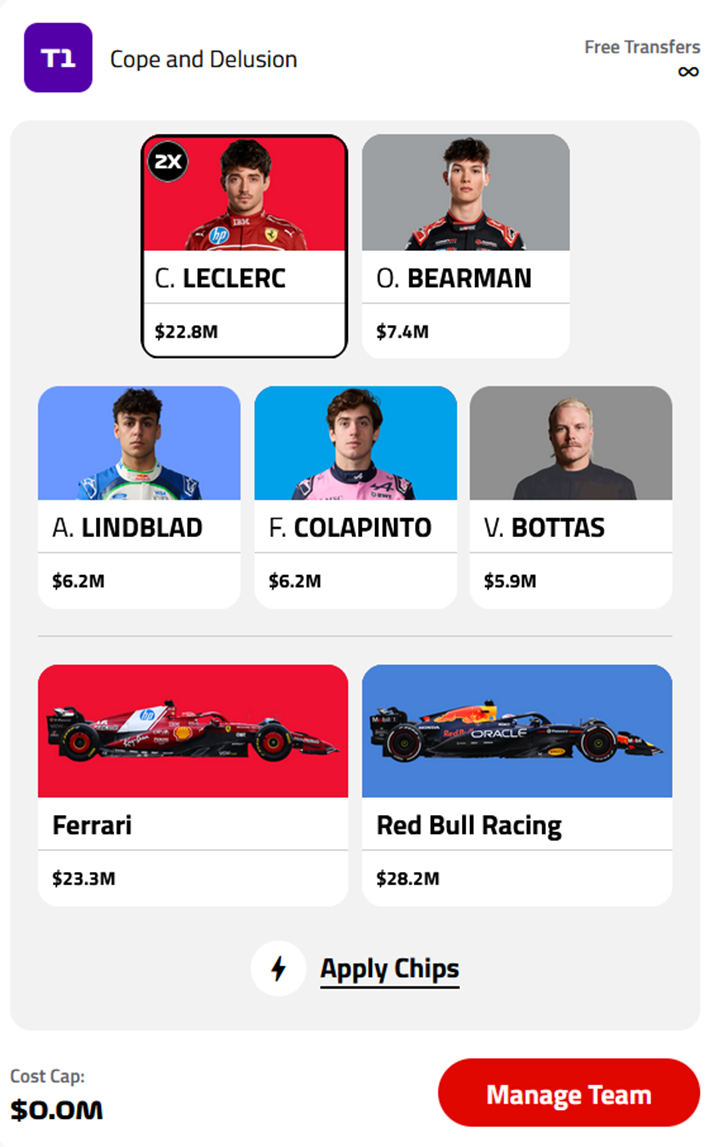 Thank you Jason for inspiring my team name this year. Some may say a Ferrari 1-2 in Free Practice 1 is Hope and Depression, but it’s validating my decision to double up on Leclerc and Ferrari. It’s definitely not cope and delusion, I swear, even though it’s my name.