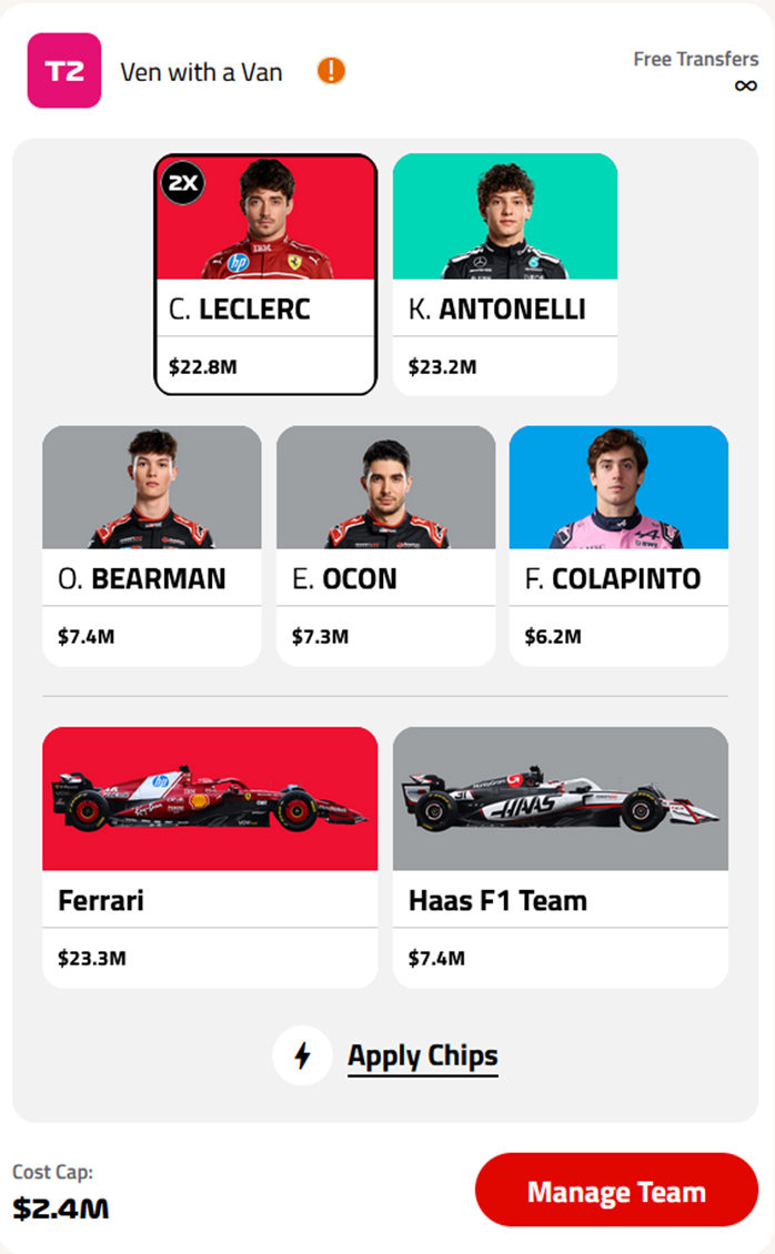 A bit of insight into my team: I’ve made maximum use of my budget, securing three premium assets, but then I rounded it out with Lindblad, Colapinto and Bottas because I can’t afford anyone else.