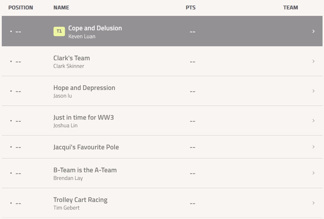 As the last one to join the league, Tim should technically be at a disadvantage, but Tim might have the most F1 knowledge out of all of us (excluding the number of championships Michael Schumacher has won).