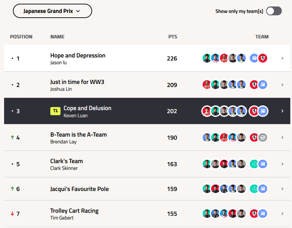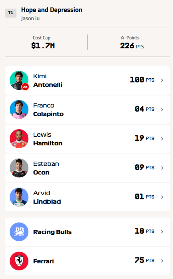 I was wondering how Josh scored more points than me when we have the exact same team aside from me selecting Leclerc (31) over Hamilton (19), and then I remembered I DRS boosted Leclerc instead of Antonelli (for the Hope and Delusion).