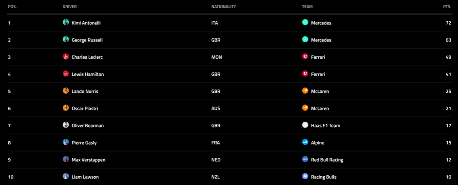 Antonelli won the race with help from a well timed safety car for 50 points, outperforming Russell’s 27 points for the second race running. More importantly, Antonelli is now ahead of Russell in the championship. We might be heading into a similar scenario to last year with Piastri starting the season strong ahead of Norris until it fell away towards the end. Looking forward to Verstappen making a late comeback once again.