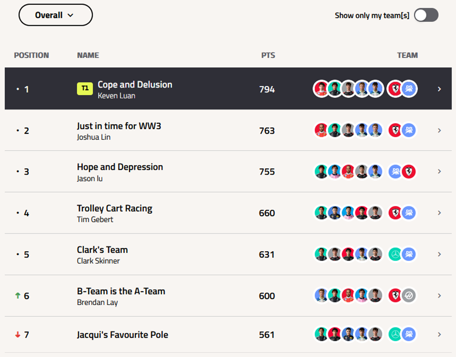 An unfortunate weekend to the trolley carts, who I’ve realised has gone for an extremely balanced team structure. Tim has no double ups on any team with a team structure of 1 Mercedes, 1 Ferrari, 1 Red Bull, 1 Alpine, 1 Haas, 1 Audi and 1 Racing Bull.