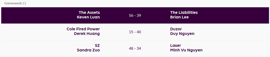 Keven’s The Assets (56, 1st) def. Brian’s The Liabilities (39, 3rd)