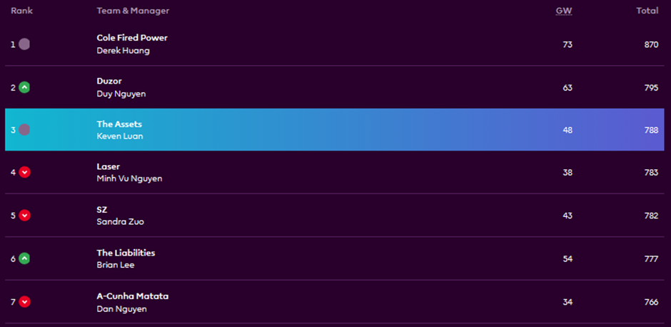 Keven’s The Assets (GW 48 / 4th, Total 788 / 3rd)