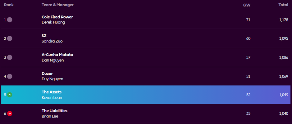 Keven’s The Assets (GW 52 / 4th, Total 1,049 / 5th)