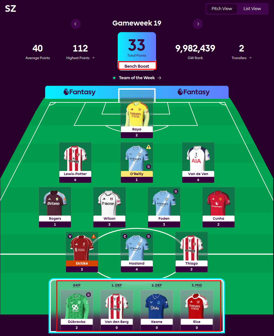 Just another successful move by Derek, wildcarding into the second best score of the Baddy League this gameweek. It was simply a matter of triple Brighton, carried by a Bart Verbruggen 9 pointer and his trusty, faithful, reliable, Jan Paul Van Hecke contributing 5 points. Derek even had the luxury of benching one of his Brighton players in Groß (6) against Burnley.