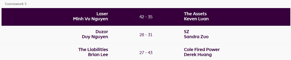 Five weeks in and we are still unable to beat Duy’s cracking GW 1 performance.
