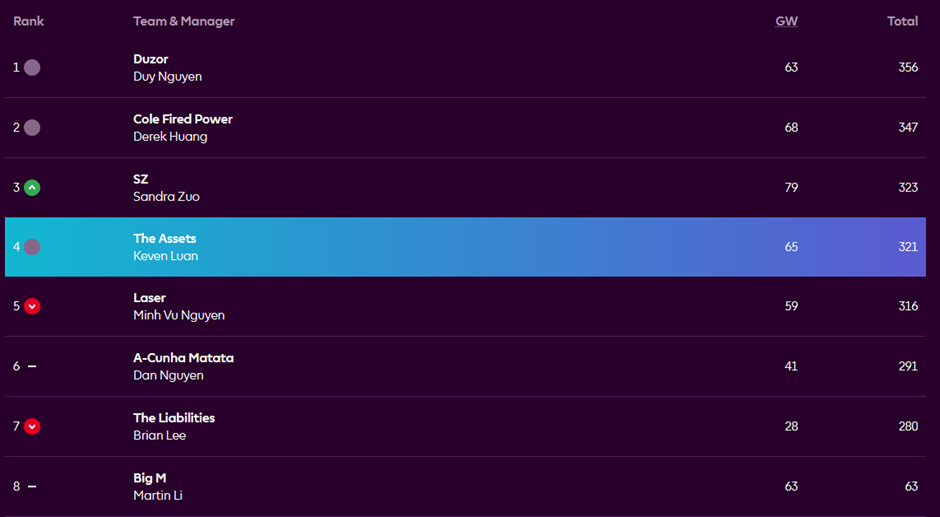 Keven’s The Assets (GW 65 / 3rd, Total 321 / 4th) (Triple Captain)