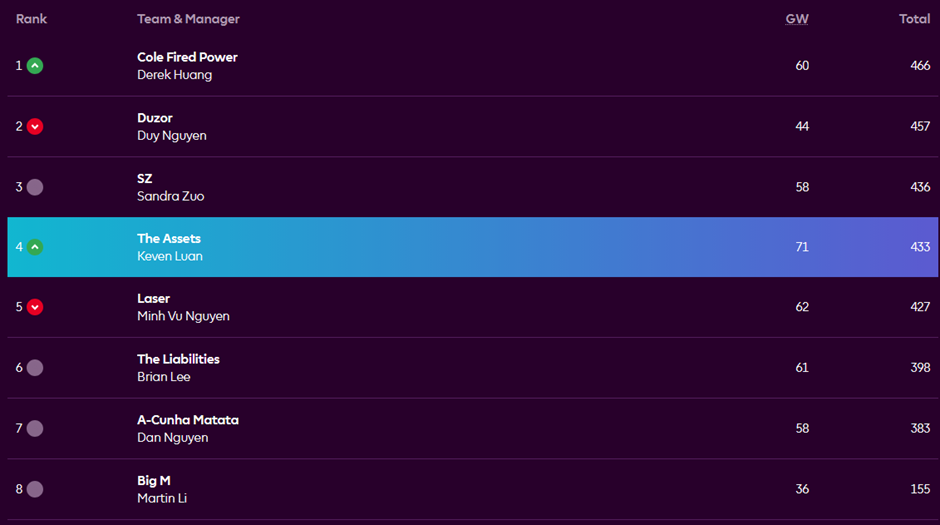 Keven’s The Assets (GW 71 / 1st, Total 433 / 4th) (Wildcarded)