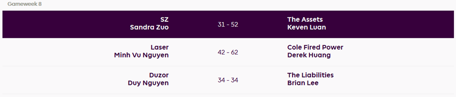 Duy’s Duzor (34, Last) drew with Brian’s The Liabilities (34, 5th)