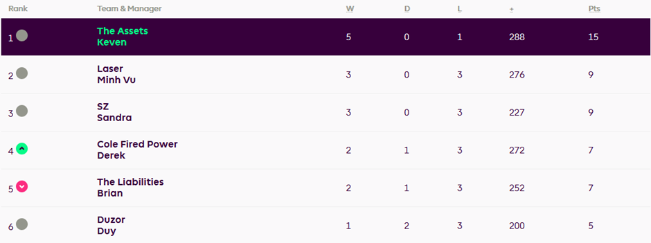 Duy is unable to maintain top spot while sustaining his Nottingham Forest trio of Anderson (4), Wood (1) and Ndoye (DNP) for the last five game weeks.